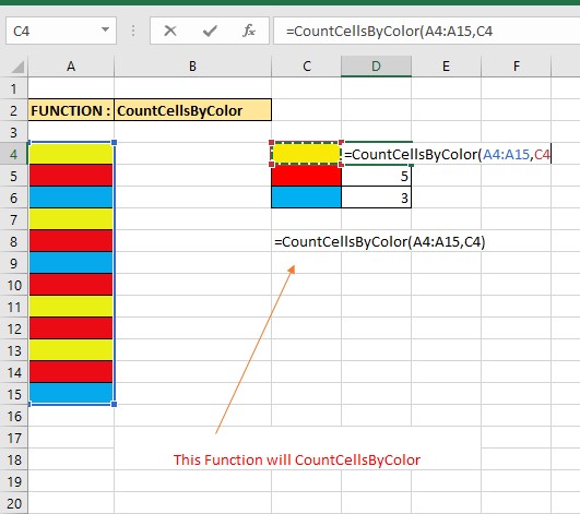 Using VBA (Custom Function): Open VBA Editor: Press Alt + F11. Insert Module: Go to "Insert" > "Module". Paste Code: Paste the following VBA code into the module: Close VBA Editor: Return to Excel. Use the Function: In a cell, Use the formula =CountColoredCells(range_to_check, cell_with_target_color).