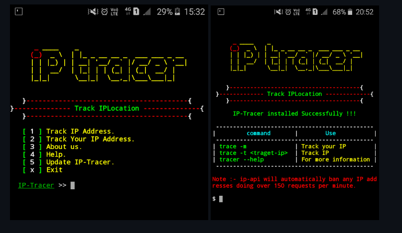 :- trace -m to track your own ip address. :- trace -t target-ip to track other's ip address for example ip-tracer -t 127.0.0.1 :- trace for more information.